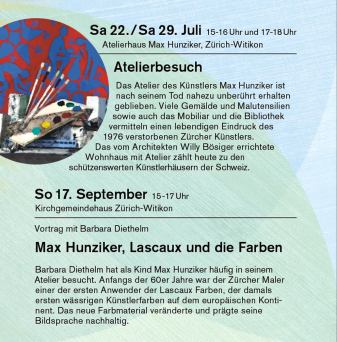 Barbara Diethelm hat als Kind Max Hunziker häufig in seinem Atelier besucht. Anfangs der 60er Jahre war der Zürcher Maler einer der ersten Anwender der Lascaux Farben, der damals ersten wässrigen Künstlerfarben auf dem europäischen Kontinent. Das neue Farbmaterial veränderte und prägte seine Bildsprache nachhaltig.